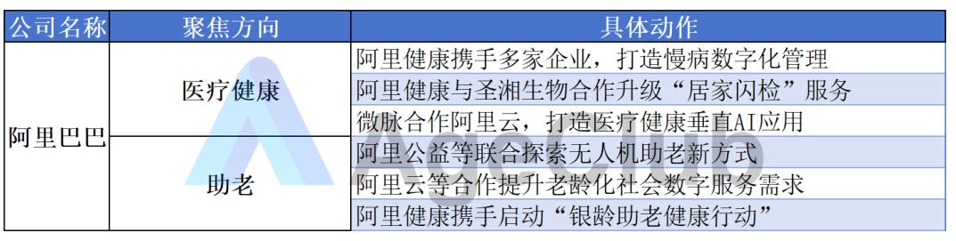 阿里巴巴的布局相对集中,主要围绕“医疗健康”和“助老”两大核心方向,突出其在健康数字化与公益服务方面的优势。