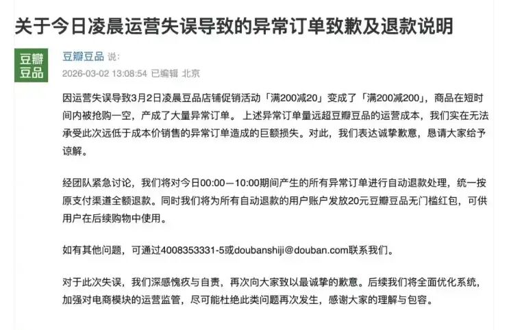短短几小时内,豆瓣豆品库存被一扫而空,话题“豆瓣薅羊毛”迅速冲上热搜。然而,狂欢在白天戛然而止。豆瓣官方发布致歉声明,以“无法承受巨额损失”为由,对异常订单进行强制退款,并补偿用户20元红包 。
