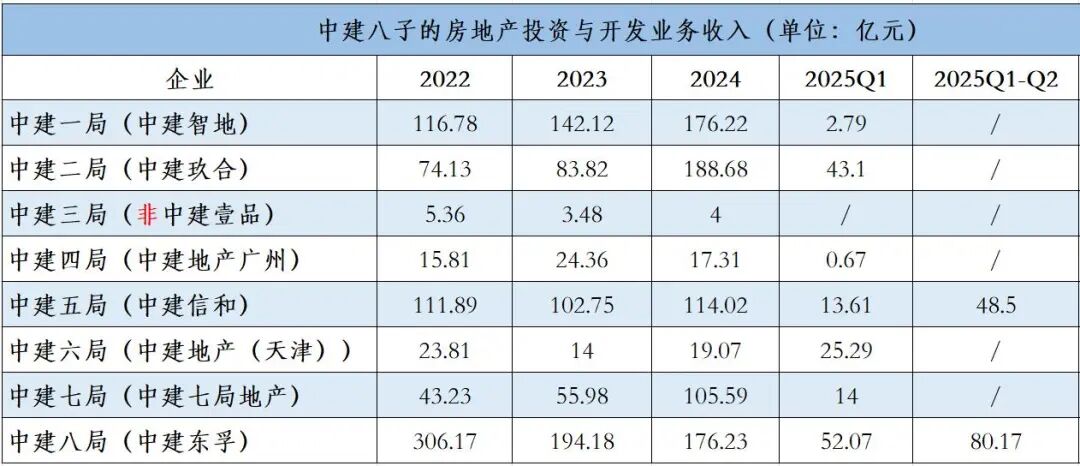 中建一局(北京)的中建智地、中建二局(北京)的中建玖合、中建三局(武汉)的中建壹品、中建四局(广州)的中建地产广州、中建五局(长沙)的中建信和、中建六局(天津)的中建地产(天津)、中建七局(郑州)的中建七局地产、中建八局(上海)的中建东孚,被统称为“中建地产”,行业内称作“中建八子”。