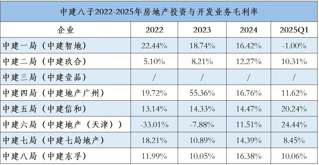 无论是拿地还是销售,对于中建系而言,更多是向上增长,在调整周期里走到靠前位置。但在行业毛利率普遍承压的背景下,“中建八子”利润表现同样呈现多元图景,背后则是各局对业务结构与风险管控的不同探索。