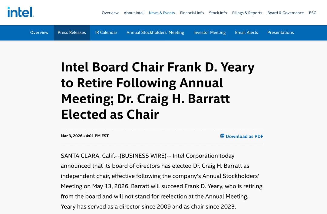 芯东西3月4日消息,今早,英特尔宣布,英特尔董事会主席弗兰克·D·耶里(Frank D. Yeary)将退休,克雷格·H·巴拉特(Craig H. Barratt)将接任,这一人事变动将在2026年5月13日英特尔年度股东大会后生效。