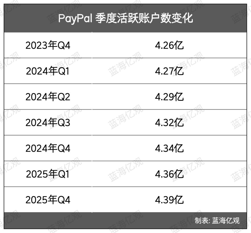 2026年2月3日,PayPal公布财报,虽然营收和利润都在增长,但是增长的速度已经变慢了很多,整体业绩低于市场预期。其作为利润的主要来源的品牌结账的活跃用户增长率,已经跌落至1%,活跃账户的交易量,也在过去12个月里也下降了5%。财报公布之后,单日股价暴跌20%,CEO亚历克斯·克里斯黯然离职。