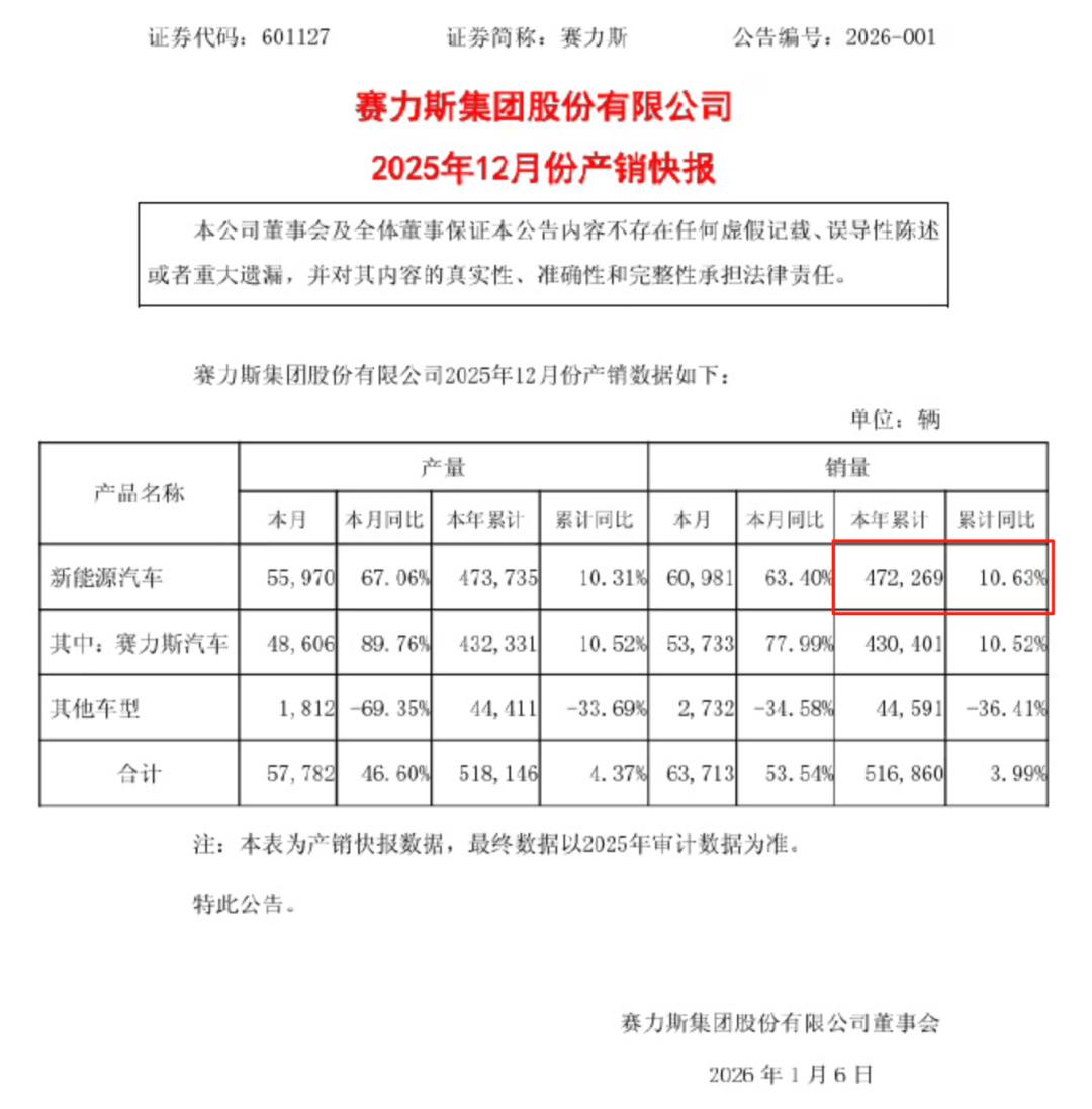 图/2025年12月赛力斯产销快报 来源/互联网 新能源观截图