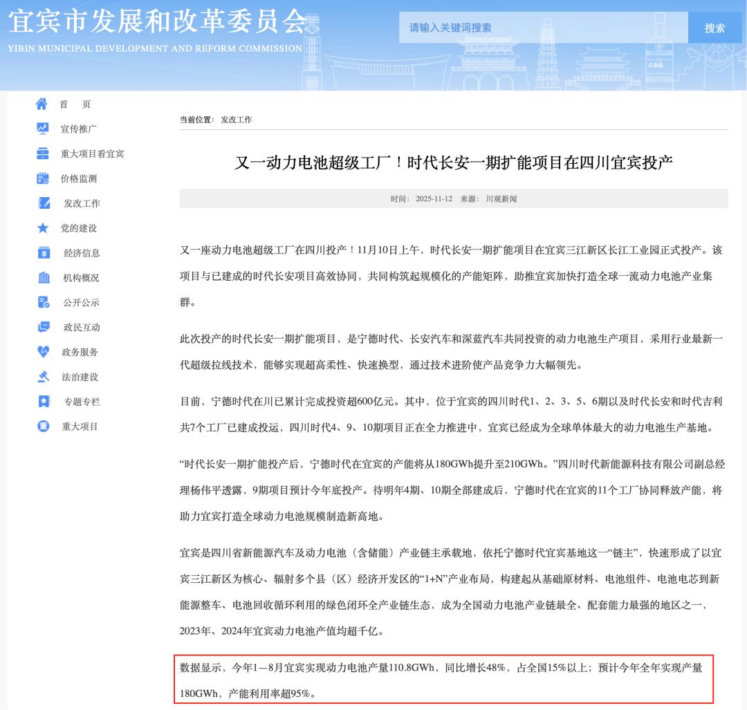 根据官方数据,2025年1至8月,宜宾动力电池产量已达110.8GWh,占全国15%以上;预计全年产量180GWh,产能利用率超过95%。这意味着,全球每卖出10块动力电池,就有1.5块来自宜宾。