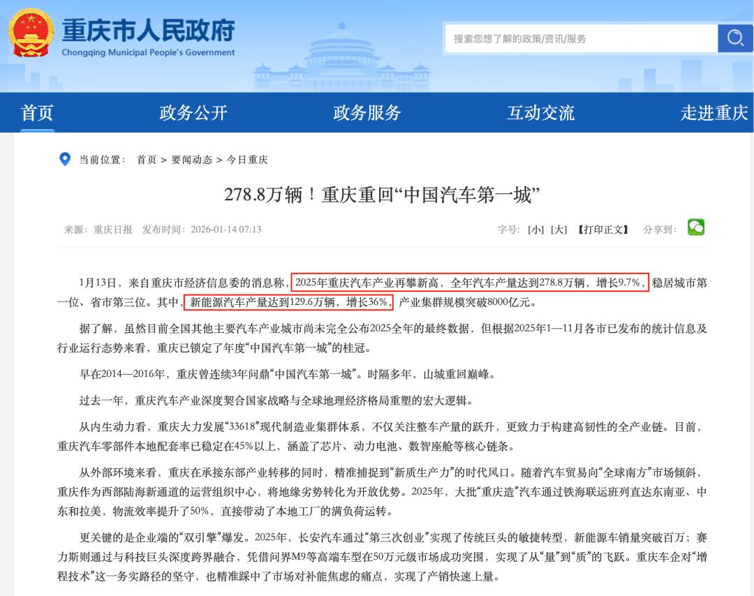 2025年,重庆以278.8万辆的总产量、129.6万辆的新能源产量,时隔九年重新夺回“中国汽车第一城”。