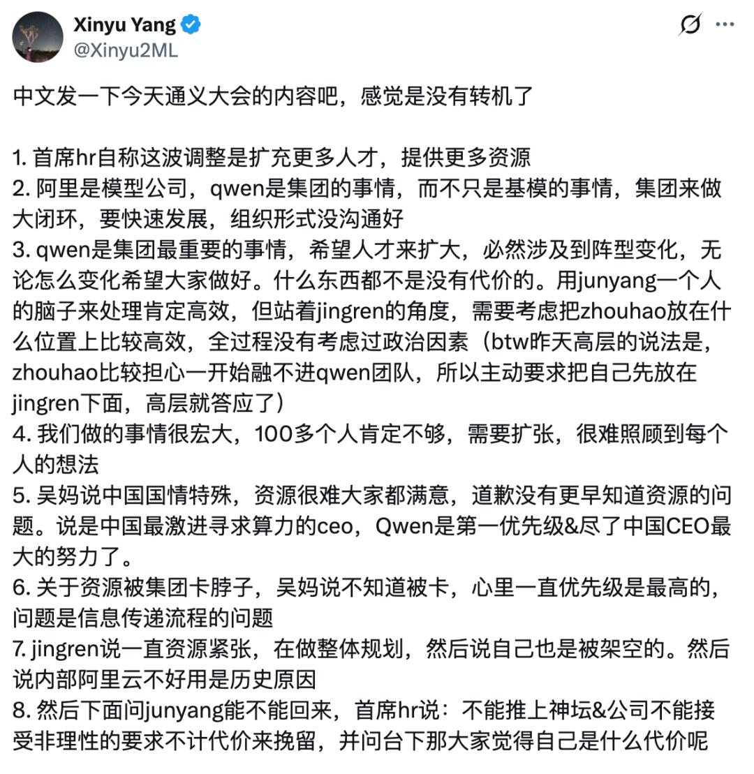 今天还流出一份吴妈给通义团队开会的摘要,信息量很多但不保真。