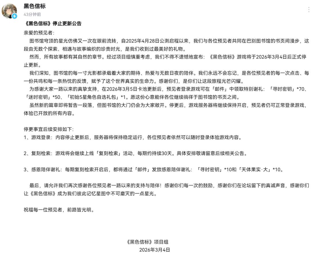 今日,由明昼科技开发的二次元箱庭ARPG游戏《黑色信标》正式宣布将于即日起停止更新,游戏将在3月5日更新最后一次卡池,此后进入“停更不停服”的状态,也会周期性开启复刻卡池和发放部分福利。