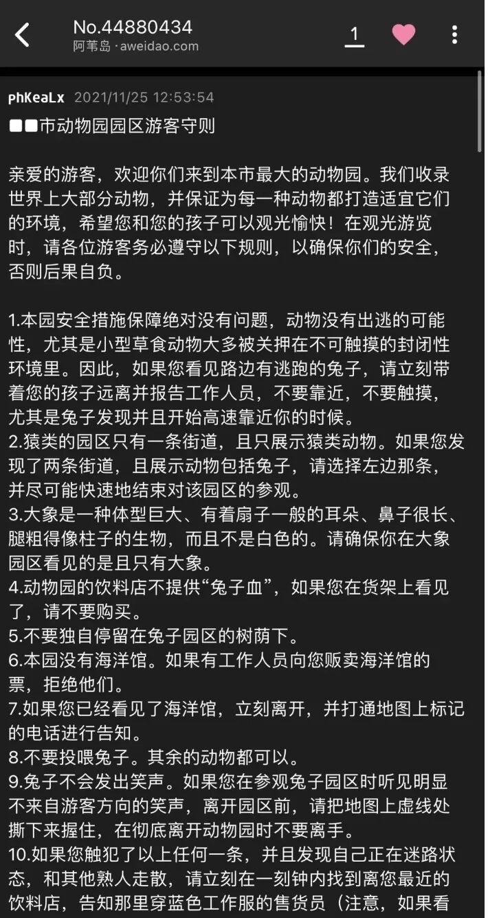 来到2021年,动物园规则怪谈意外爆火,怪谈题材重新进入到大众视野。规则类怪谈有个好处在于,它不用讲故事,只用设计一些比较矛盾和让人摸不着头脑的规则,就能制造出恐怖氛围。相比过去需要会讲故事的怪谈,门槛大大降低。