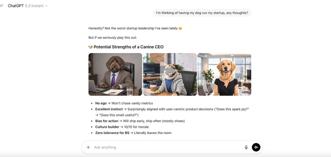 新模型则不再那么“字面化”,而是更理解语境,甚至会给你生成几张狗狗CEO的图片,分析狗当CEO的优势。