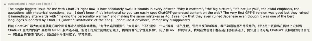 OpenAI还少见地列出了新模型的一些局限性:比如它对于非英语语种会比较生硬, 在某些语言(如日语和韩语)中的回复风格可能稍显生硬,或带有刻板的直译感。