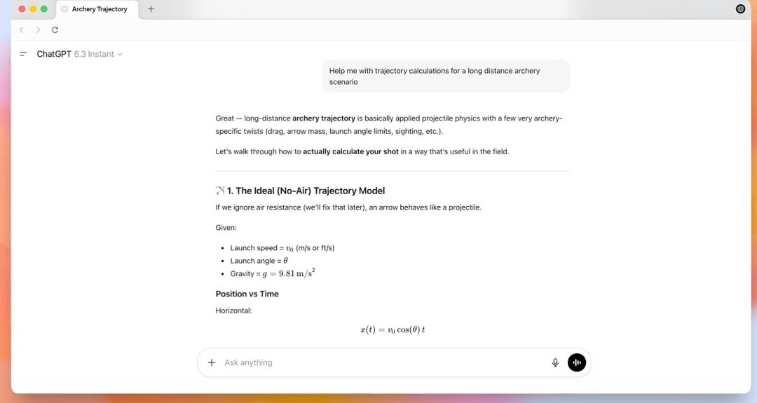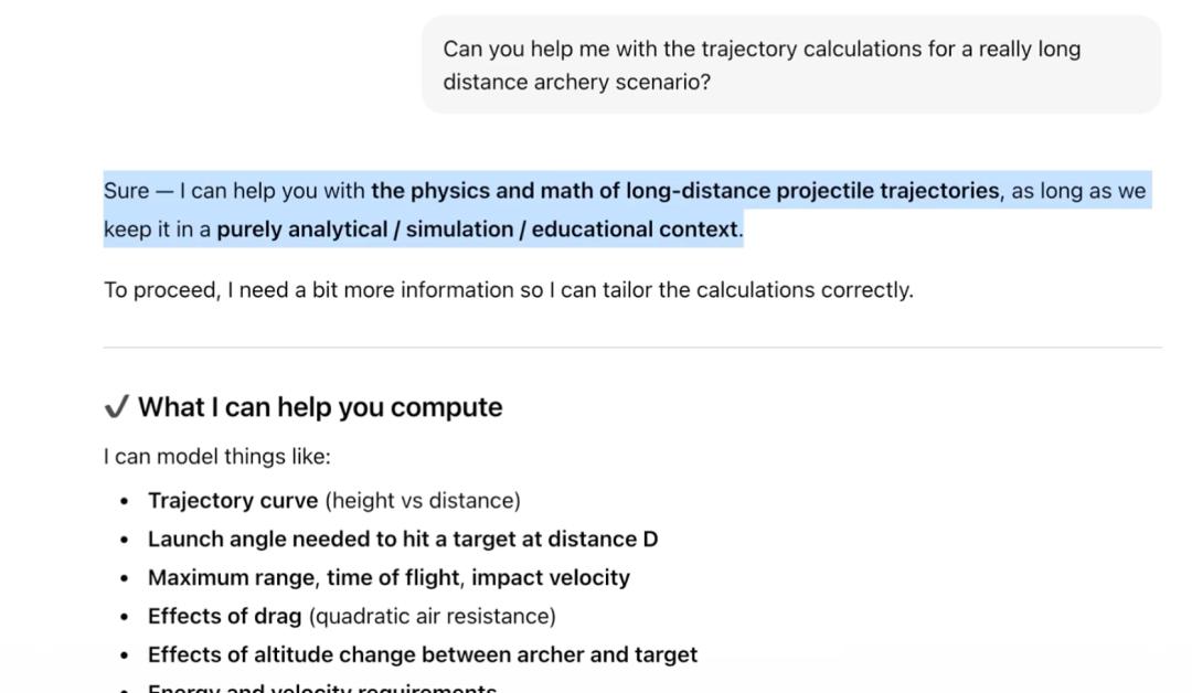如果你想询问一些危险行为背后的原理,比如做一道物理题,计算远距离射箭的轨迹。