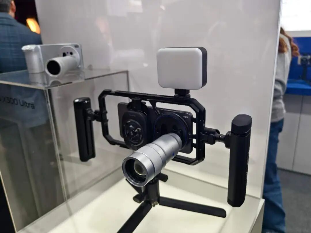此次vivo的展位虽然不大,尚未发布的vivo X300 Ultra专业摄影套件却吸饱了观众目光。在手机上装了400mm的蔡司增距镜,还有SmallRig专业视频拓展套件,有专业手柄、散热器、补光灯。