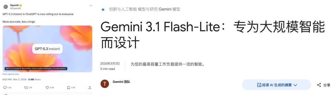 北京时间3月4日,OpenAI 正式推送 GPT-5.3 Instant,覆盖全量 ChatGPT 用户;同一天,Google 也发布了 Gemini 3.1 Flash-Lite,宣称这是 Gemini 3 系列"速度最快、最具成本效益"的模型。