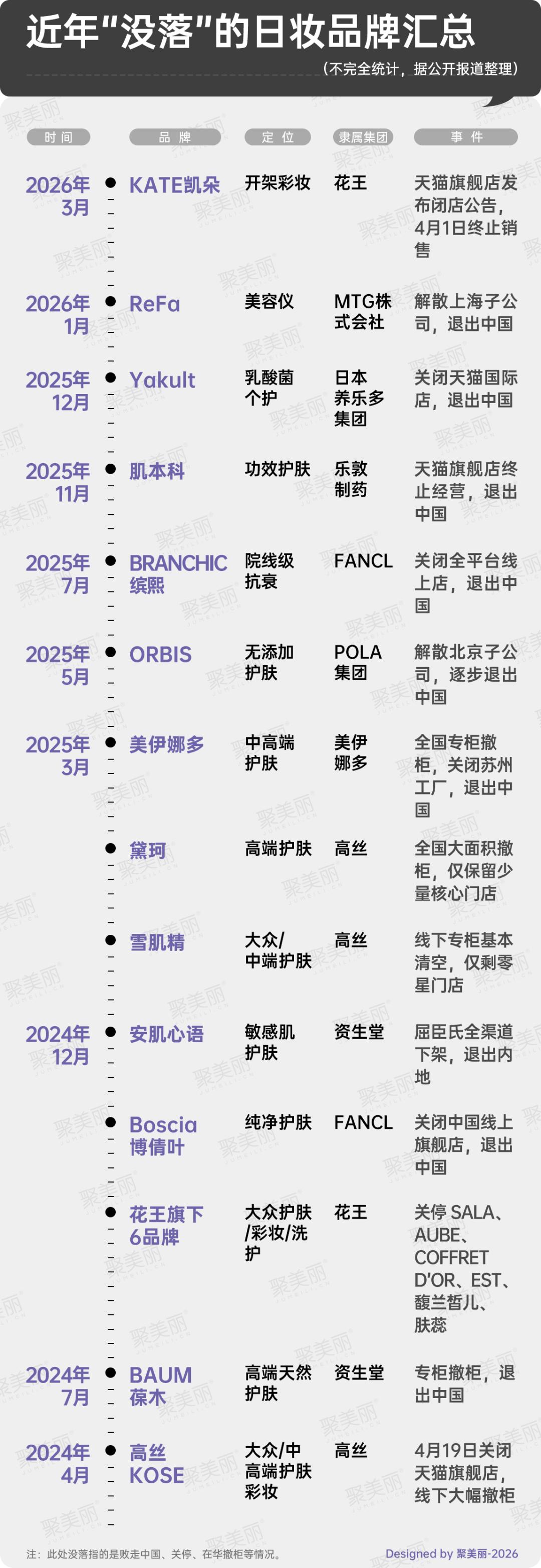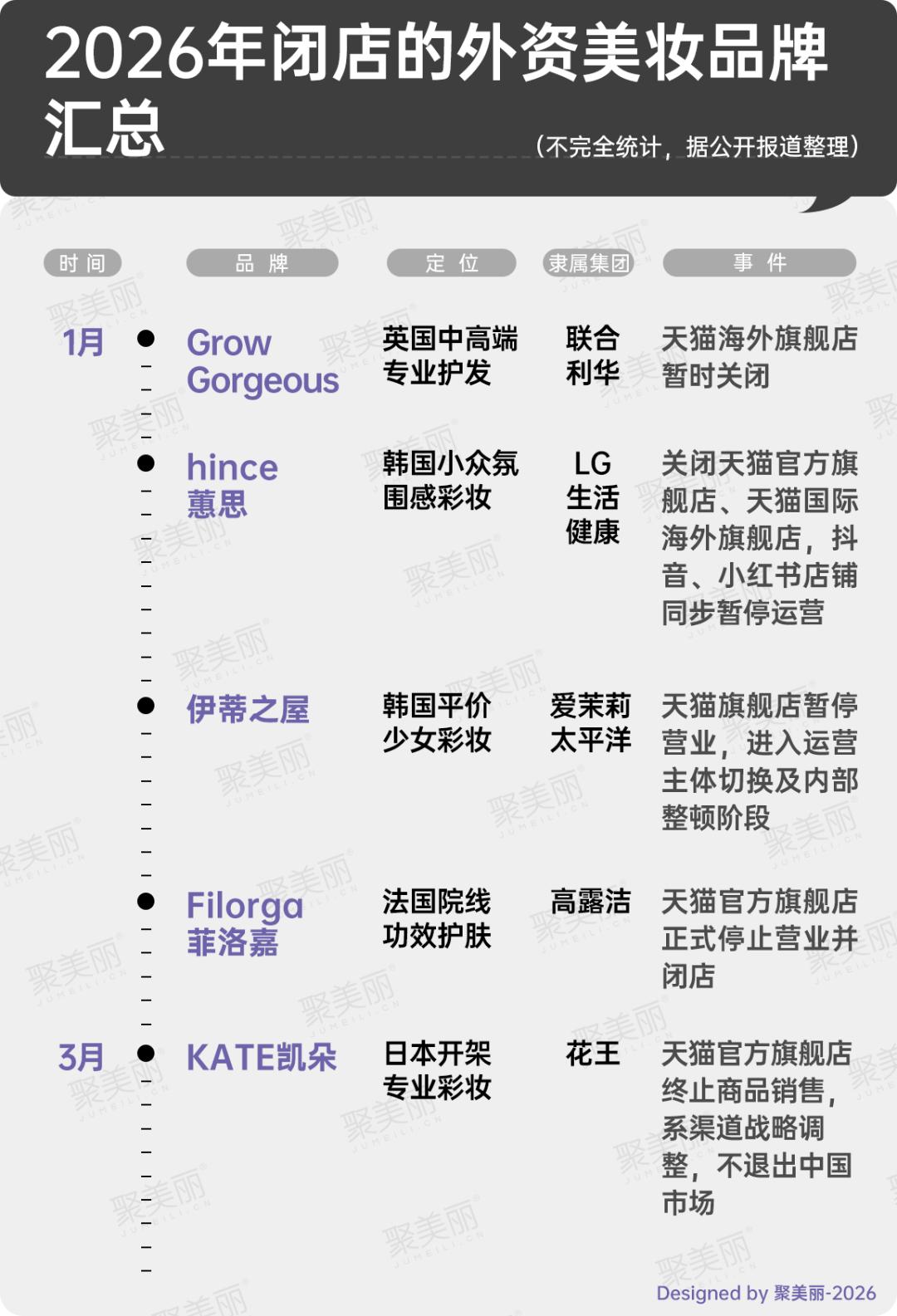 事实上,KATE的困境,正是当下外资美妆在华遇冷的缩影。据聚美丽不完全统计,2026年开年至今,已有hince、菲洛嘉、伊蒂之屋、Grow Gorgeous、KATE等5个外资品牌陆续关闭中国线上旗舰店,一场外资美妆的撤退潮正在上演。