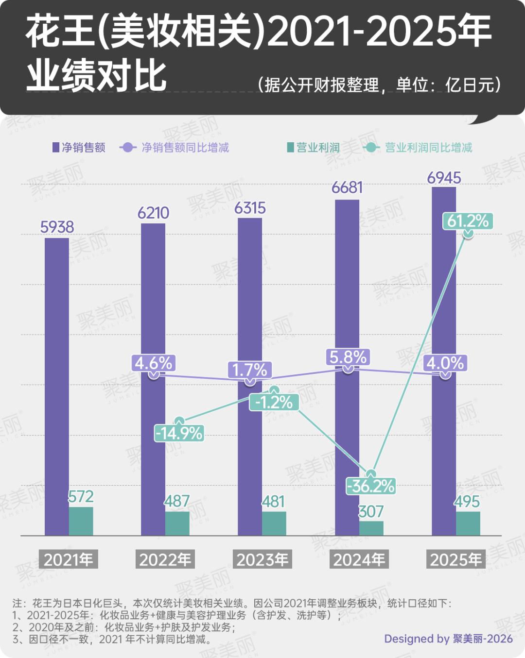 对比近5年(2021-2025年)的业绩表现来看,花王(美妆相关)的盈利能力曾一度大幅减弱。尤其是2022-2024年期间连续三年营业利润下滑,2024年更是大幅减少36.2%。