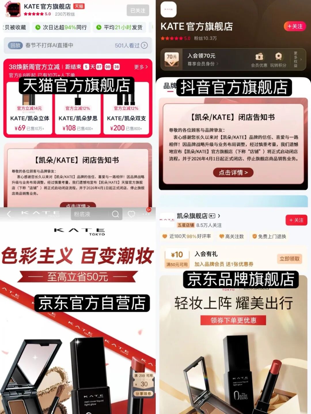 如今,继贝玲妃全线撤店、退出主流电商之后,KATE也正式官宣闭店,一个时代的日系开架彩妆记忆就此落幕。