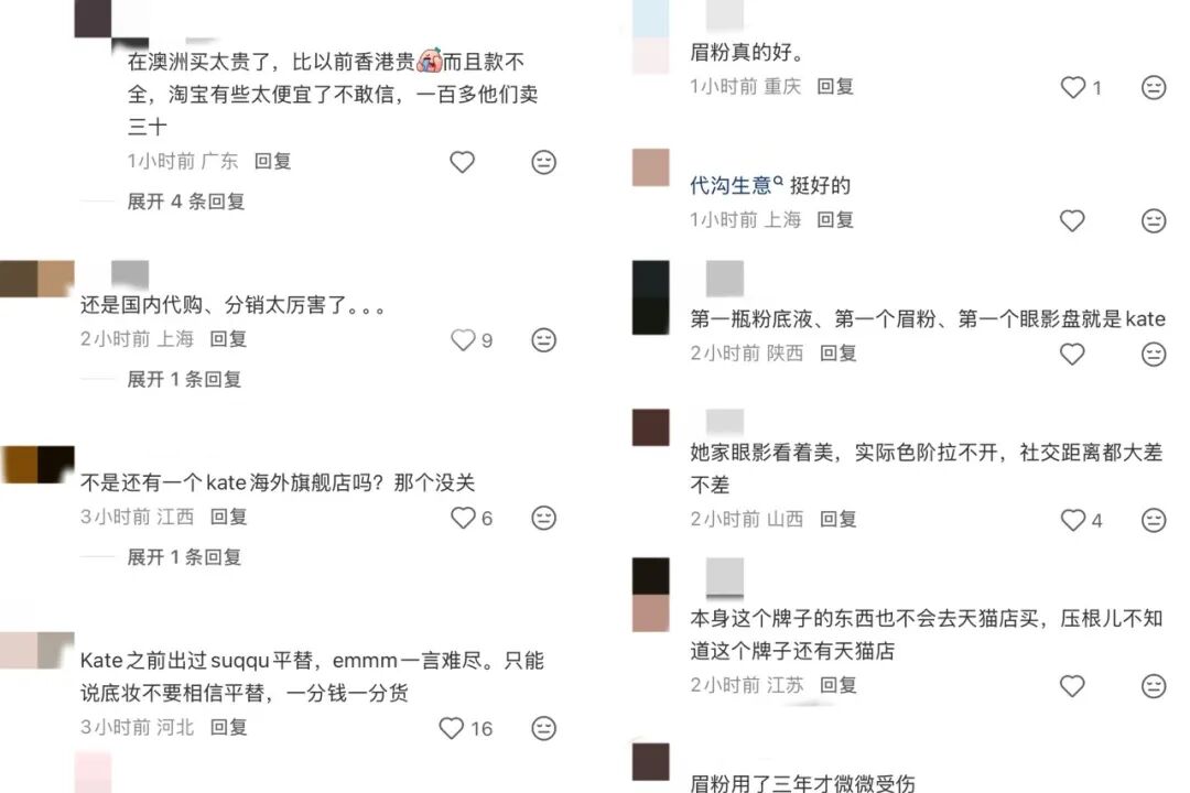 不少老粉则回忆道,人生第一瓶粉底液、第一块眉粉、第一盘眼影都来自KATE;也有用户直言其眼影显色度一般、色阶层次不足,且日常购买更倾向于非官方渠道。