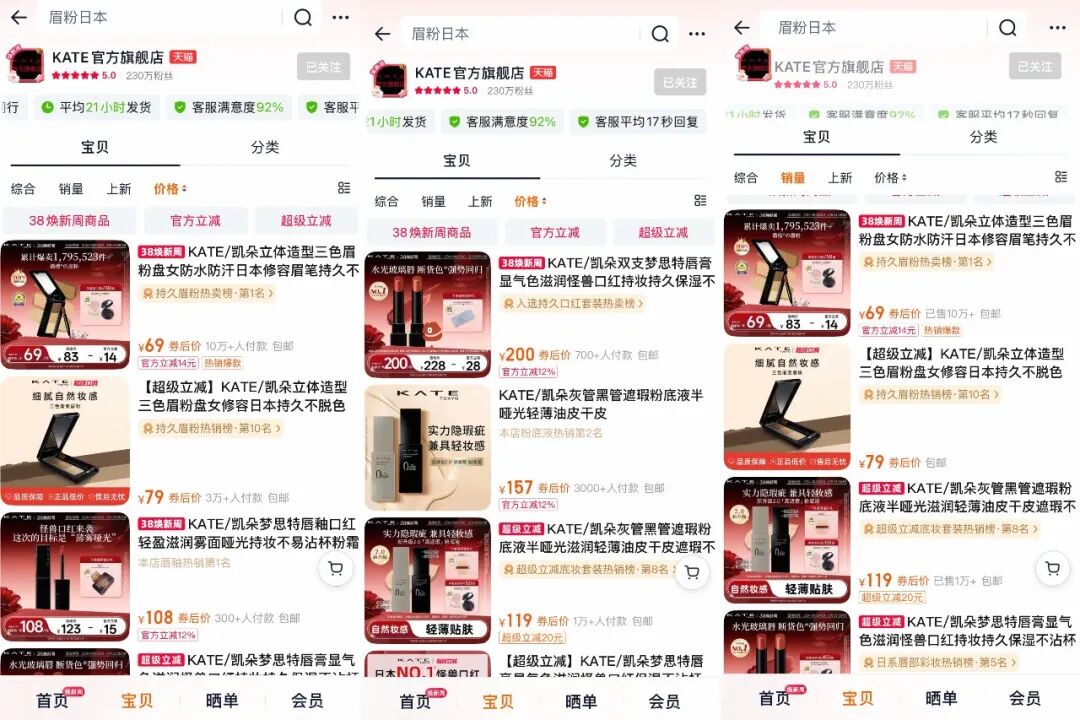 截至目前,KATE天猫官方旗舰店累计粉丝已达230W,店铺评分5.0 。其中,三色眉粉依旧是品牌销量冠军,月销10W+,稳居天猫持久眉粉热卖榜TOP1。