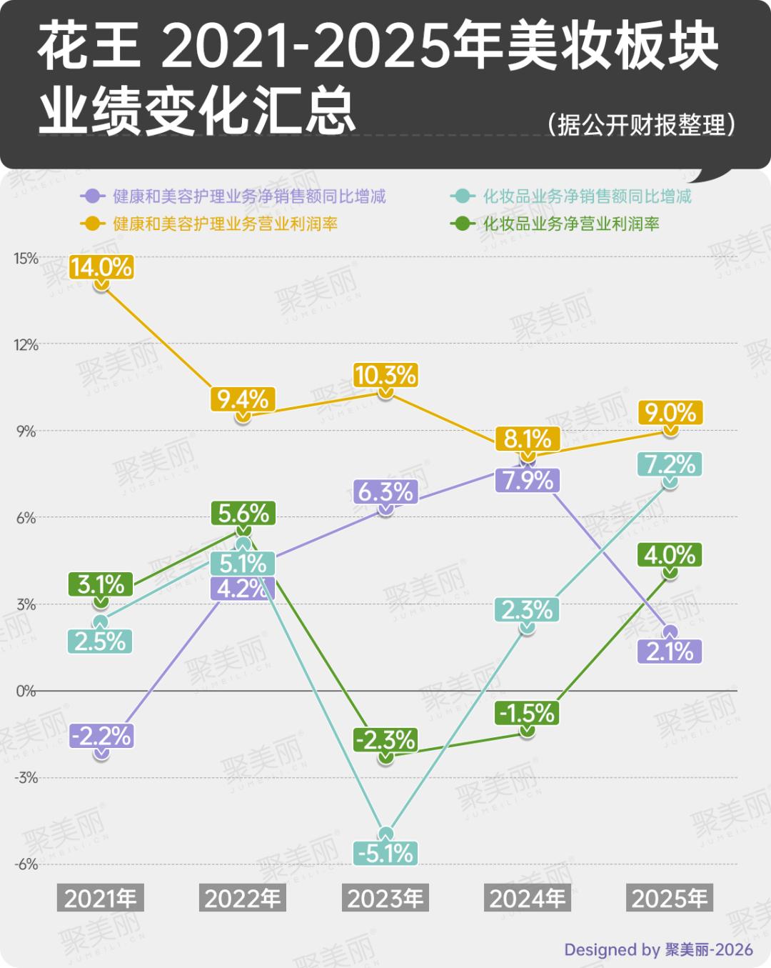 同时,从健康和美容护理、化妆品两大业务板块来看,花王化妆品业务在2023年遭遇销售额和营业利润双双下降,尤其是2023-2024年更是连续两年净营业利润率呈现负增长。