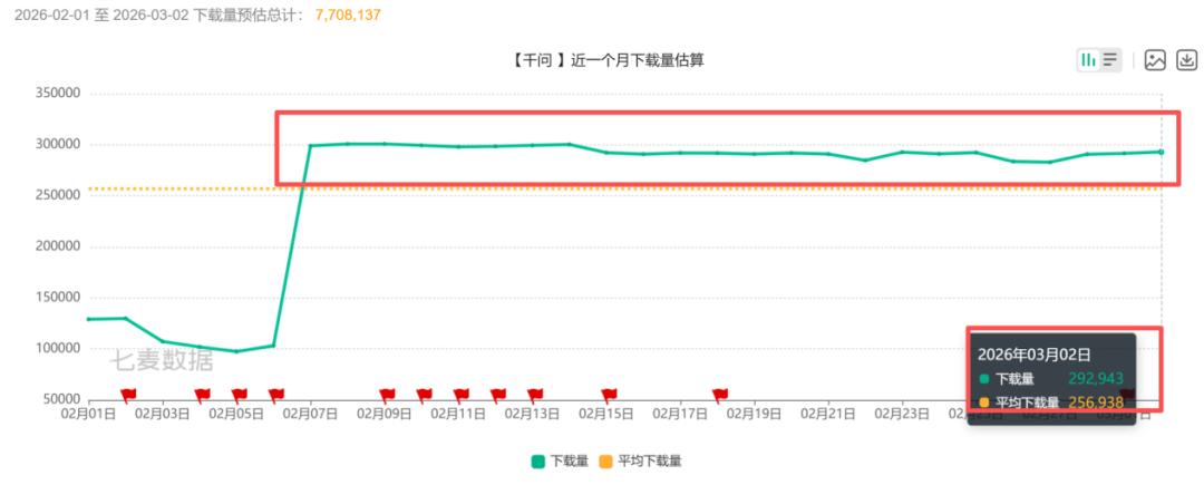 而在2月2日千问公布“春节请客计划”后,千问App五日后日下载量迅速提升至约29.90万,较官宣当日的12.98万下载量提升约130.35%。至3月2日,千问日下载量仍维持在29.29万水平,较官宣当日提升约125.66%。
