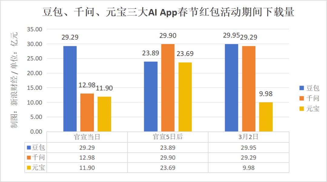 不过该数据可能与红包活动的持续性相关。据悉,元宝App的红包活动在2月17日0点便已结束。而千问App的首批千问免单卡有效期则延长到了3月3日(元宵节)24点,豆包App也将在3月3日继续发放元宵节红包。