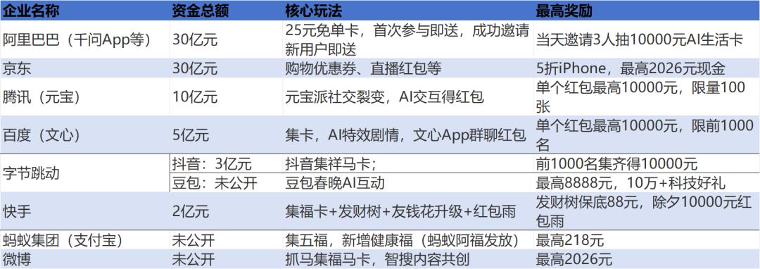 据《BUG》栏目不完全统计,今年春节,参加“红包大战”的企业中,公开红包投放金额的企业累计金额超80亿元,若加上字节跳动、支付宝等并未明确公布金额的厂商,今年红包大战累计投入资金或达100亿元。其中,尤以字节跳动豆包、阿里巴巴千问、腾讯元宝三家组成的“千元豆”AI红包军团出手最为阔绰,合计发出超40亿元红包。