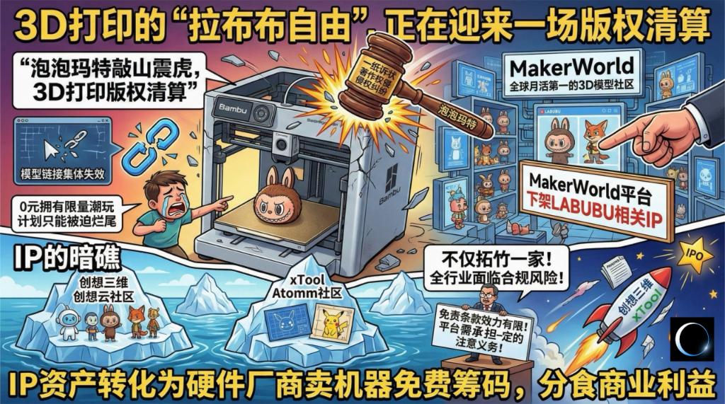 当一台售价几千元的3D打印机,能够轻易且毫无阻力地“造”出一只拉布布、一个星星人、一只米妮时,这种看似零成本的“平替”本质上是将版权方的核心资产,转化为了硬件厂商卖机器的免费筹码。