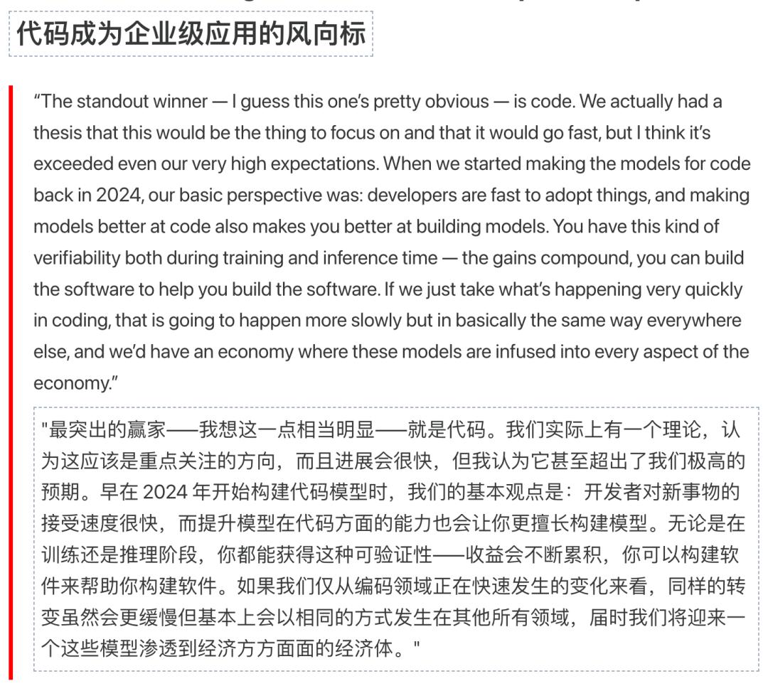 在这次会议上,Dario透露了一个关键信息:代码生成是目前AI能力爆发的最强领先指标。