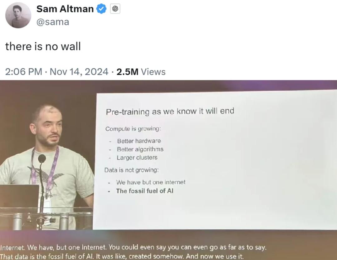 早在2024年,Ilya就曾提过现在给AI训练的燃料要用尽了。(不过当时奥特曼说了,没有墙)