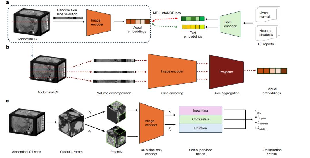 图 | 替代架构实验。a–c,基线模型包括五个二维视觉语言模型(2D VLMs)(a)、三个二维到三维提升的视觉语言模型(2D-to-3D lifted VLMs)(b)以及两个纯三维视觉模型(3D vision-only models)(c),用于评估 Merlin 数据集的不同训练策略。基线模型作为与 Merlin 数据集的对比基准。基线模型的训练流程亦予以说明。