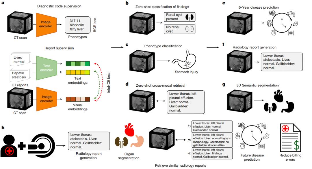 在实际应用层面,该模型有望成为放射科医生的得力助手,通过自动化生成结构化报告、辅助进行准确的诊断编码(ICD编码)以及快速检索相似历史病例,大幅降低因重复性劳动带来的工作负荷,并有效减少人为计费错误。更重要的是,Merlin 展现出了超越人类视觉局限的潜力。它能够从复杂的 3D 体积数据中深度挖掘出那些在常规阅片过程中极易被忽视的早期疾病生物标志物。