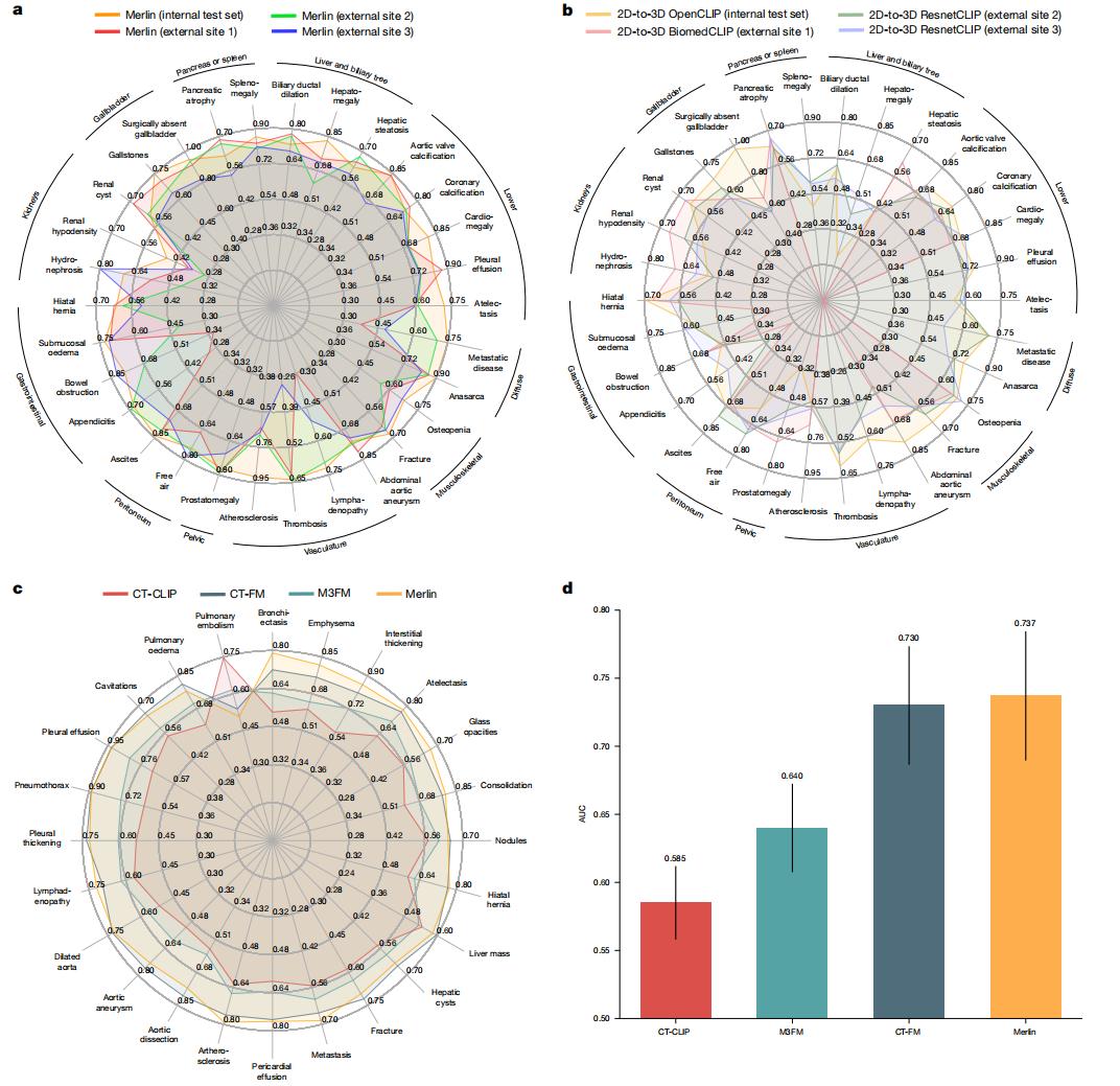 图 | 腹部与胸部 CT 扫描的外部验证。这些结果证明了 Merlin 在来自外部站点的 44098 例腹部和胸部CT扫描中的卓越性能。