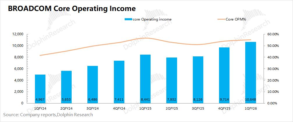 相比于净利润,海豚君认为核心经营利润(=毛利润-研发费用-销售及管理费用)更能反应公司真实的经营情况。博通AVGO本季度实现核心经营利润106.5亿美元,环比增加9亿美元,主要来自于AI业务增长的带动。
