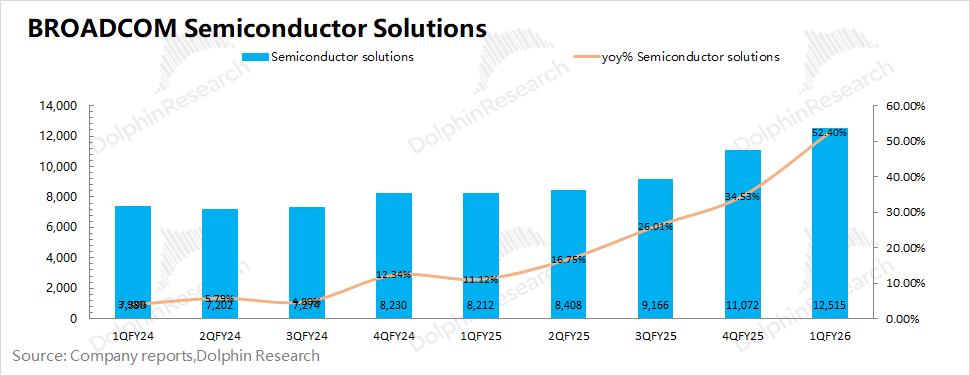 博通BROADCOM (AVGO.O)在2026财年第一季度的半导体解决方案实现营收125亿美元,同比增长52%。公司半导体业务本季度的增长主要来自于AI业务的带动,非AI业务保持平稳。