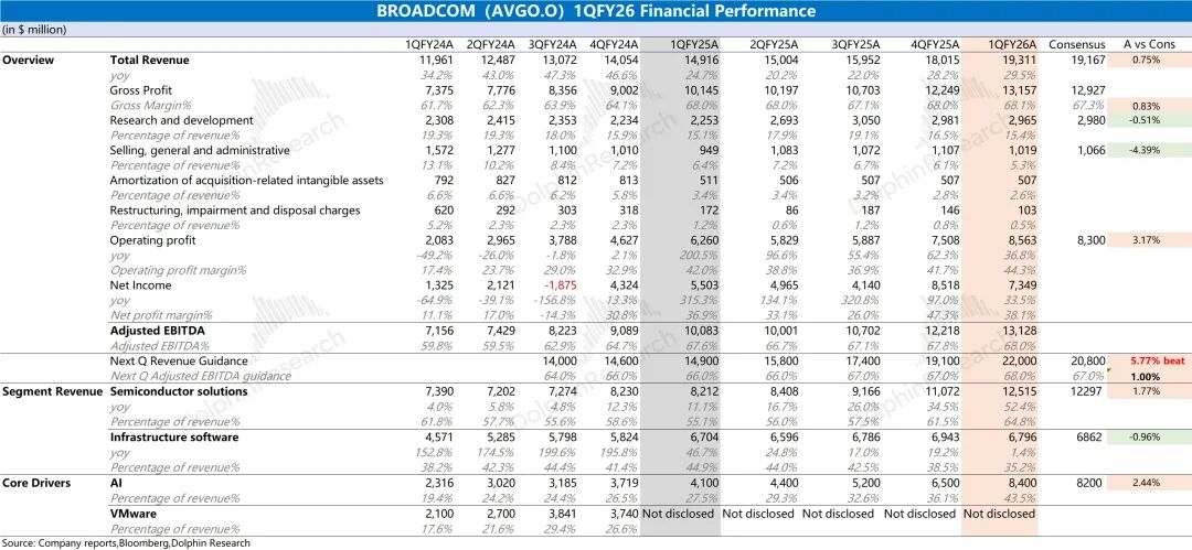 博通 (AVGO.O)北京时间2026年3月5日凌晨,美股盘后发布2026财年第一季度财报(截至2026年1月):