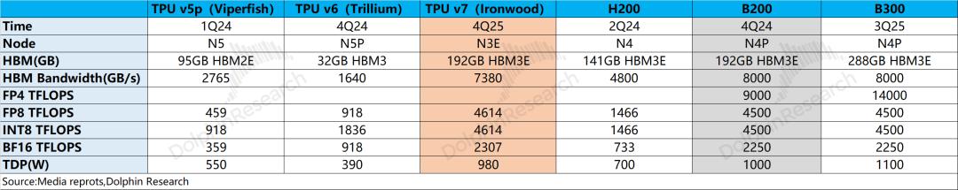 当前TPUv7已经开启量产出货,对比英伟达的GPU来看,TPUv7在FP8等领域的表现大致已经接近于英伟达的B200(2024年四季度量产),谷歌TPU大致落后于英伟达一年左右。