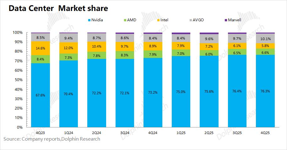 b)AI芯片份额:在AI芯片市场中,英伟达仍处于绝对领先的位置,博通AVGO扮演者“追赶者”的角色。