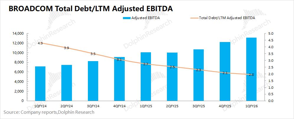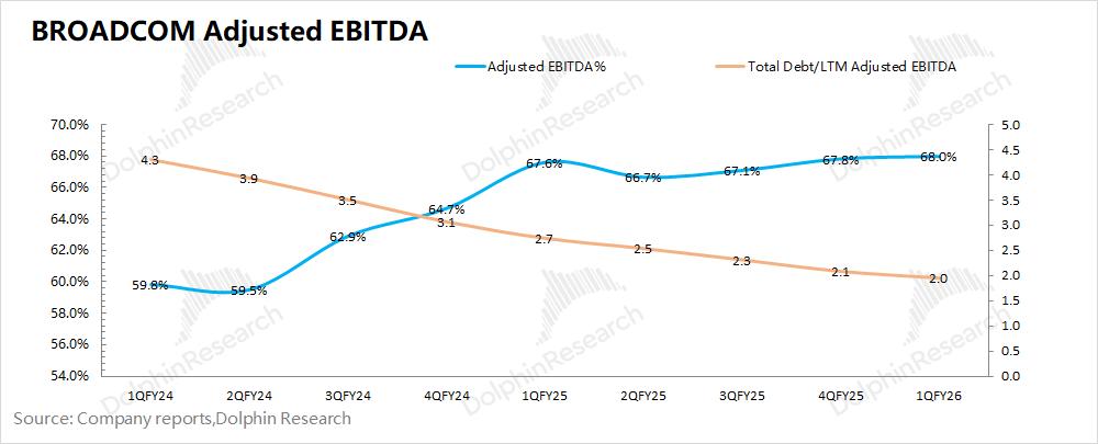 由于博通擅长外延并购,公司通常把调整后EBITDA%作为公司的经营面指标之一。而海豚君测算公司2026财年第一季度的调整后EBITDA%回升至68%,公司此前指引(67%)。