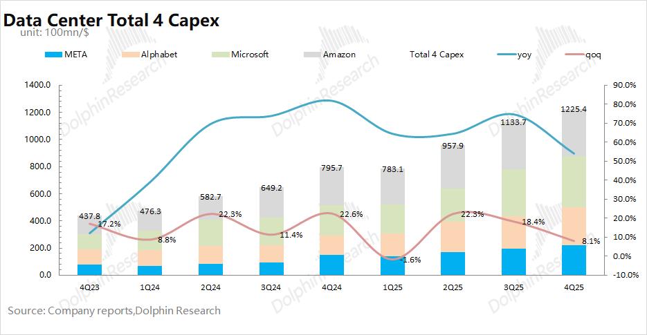 结合各家大厂指引,海豚君预计四大核心云厂商(谷歌、Meta、微软和亚马逊)的合计资本开支在2026年有望达到6600亿美元,同比增速达到60%以上,为AI芯片市场在2026年的增长提供了保障。