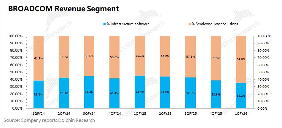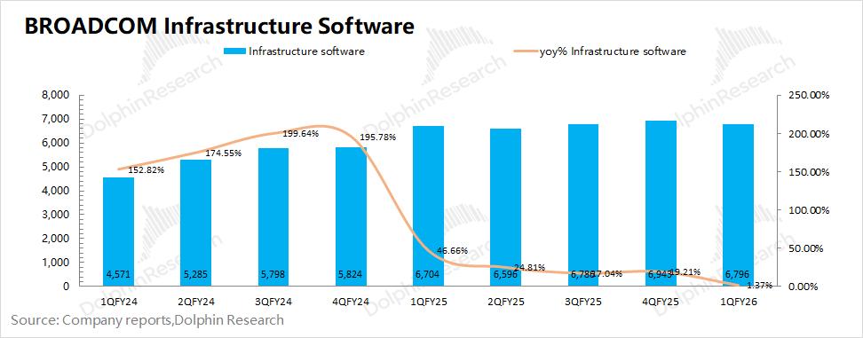 博通BROADCOM (AVGO.O)在2026财年第一季度的基础设施软件实现营收68亿美元,同比增长1.4%。此前VMware并购整合的影响已经被消化,之后主要关注于业务内生增长表现。