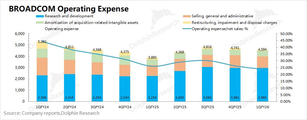 博通BROADCOM (AVGO.O)在2026财年第一季度的经营费用为46亿美元,环比略有回落。