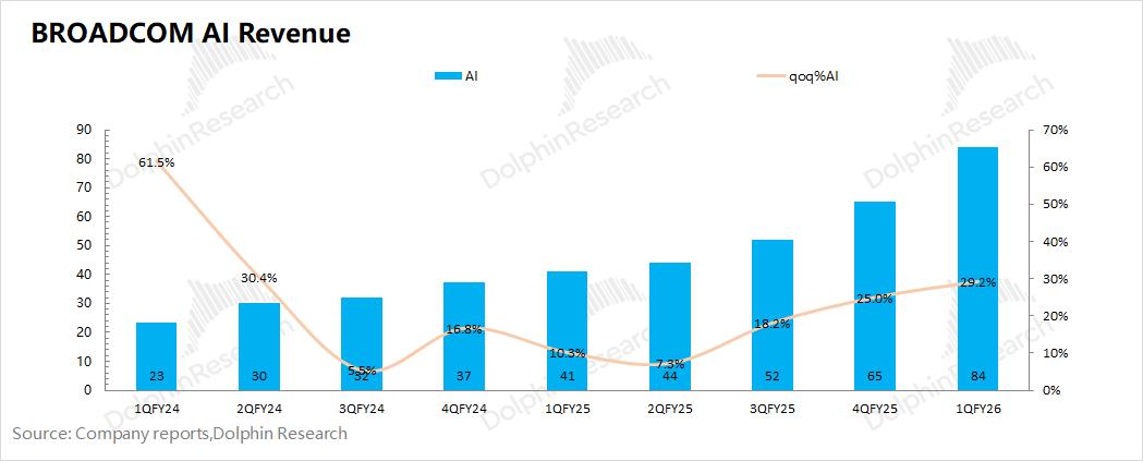 ①AI业务:84亿美元,环比增长19亿美元,好于市场预期(82亿美元)。公司的AI收入来自于三大客户(谷歌、Meta和字节),季度增长主要来源于大客户谷歌TPU出货增加的带动。