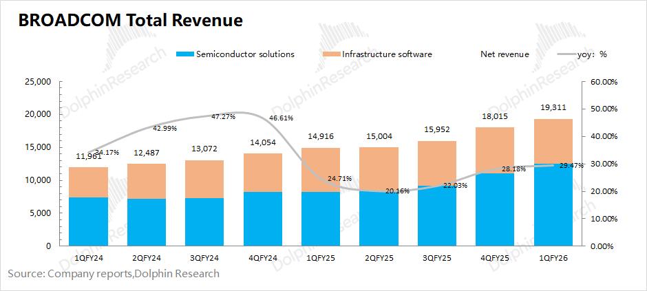 博通BROADCOM (AVGO.O)在2026财年第一季度实现营收193亿美元,同比增长29.5%,符合市场预期(192亿美元)。同比增长主要来自于AI业务增长的带动。