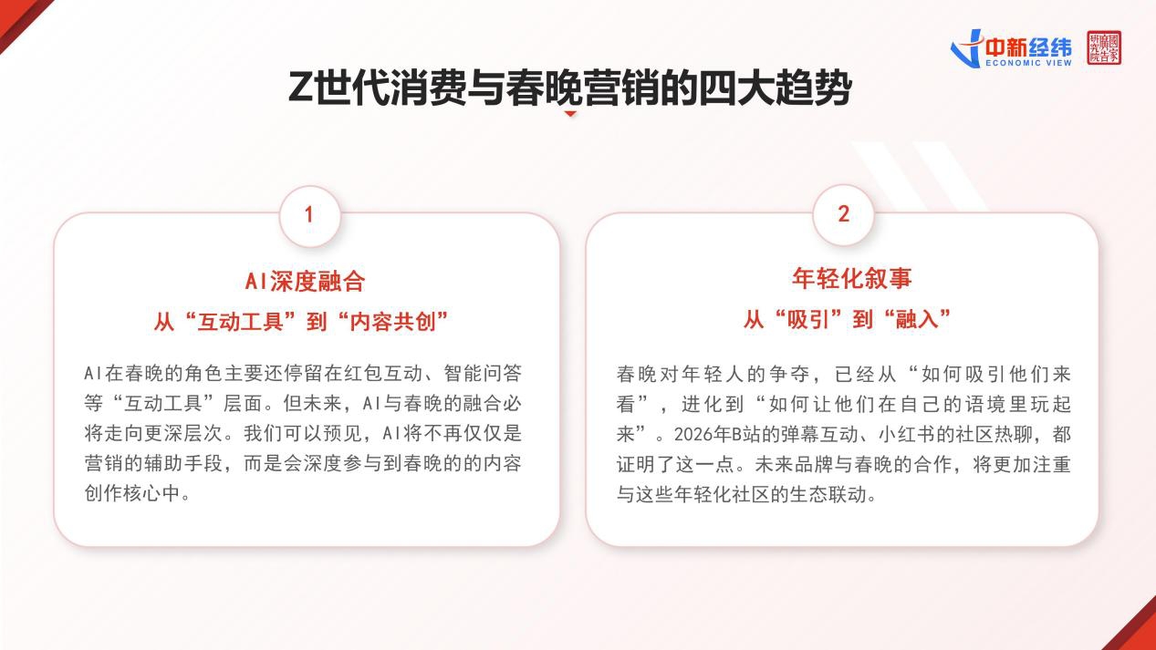 展望未来,《报告》认为,Z世代消费与春晚营销将呈现四大趋势。第一,AI深度融合,从“互动工具”到“内容共创”。第二,年轻化叙事,从“吸引”到“融入”。第三,IP实体化,从“看到”到“拥有”。第四,品效协同,从“短期曝光”到“长期经营”。