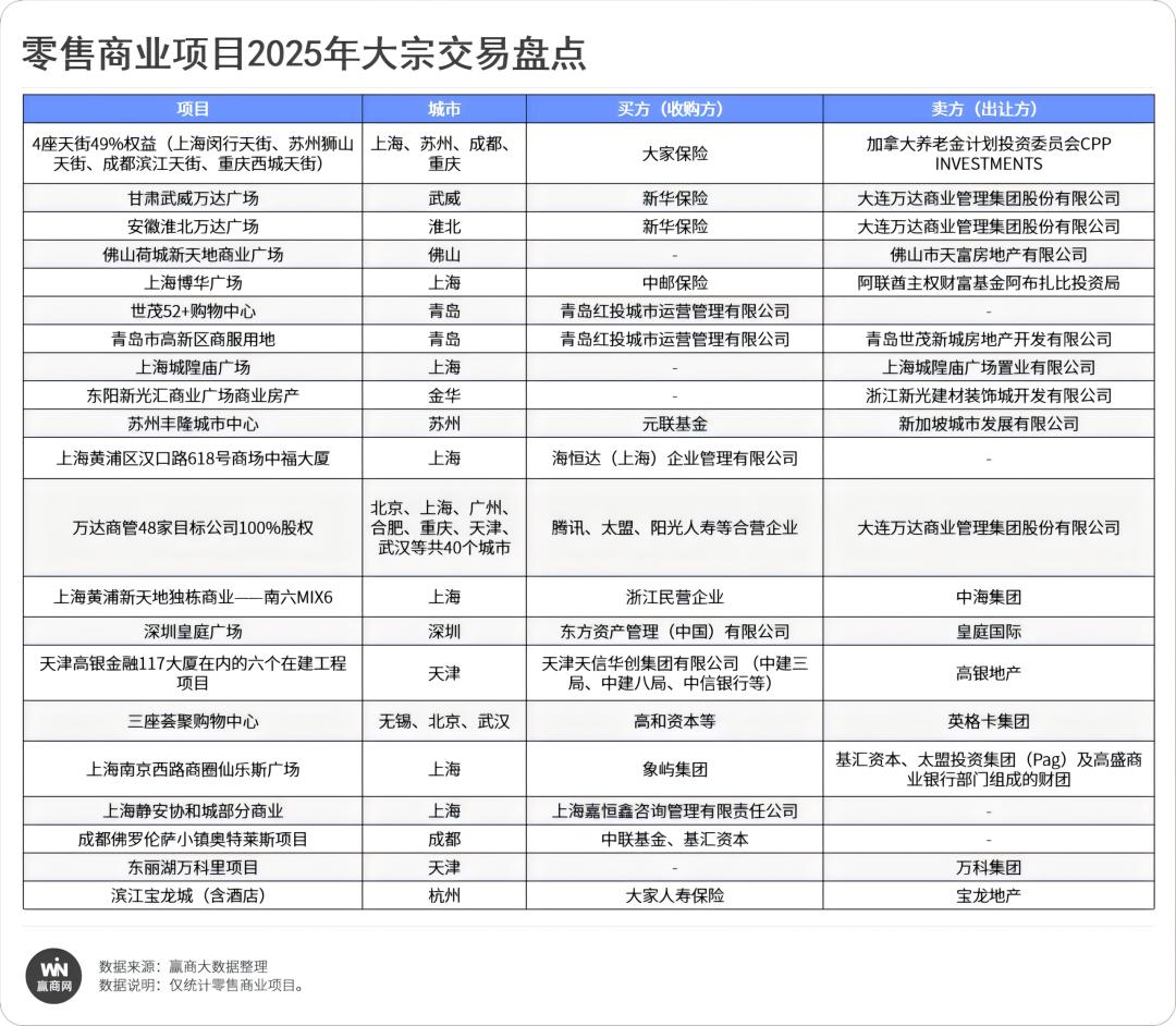 与之相对,卖方阵营则以民营企业为主导,大连万达商管单家就出让3笔资产,叠加加拿大养老金、阿布扎比投资局等外资机构的退出,形成 “险资接盘、民企+外资出让” 的鲜明交易逻辑。