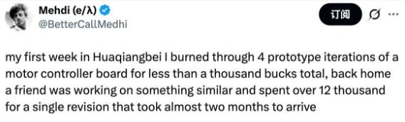 他分享了一个具体案例:在华强北,他一周内就完成了一块电机控制板的4次原型迭代,总成本不到一千美元。而在他欧洲的老家,一个朋友做类似的项目,光一次修改就花了一万两千多美元,还等了将近两个月。