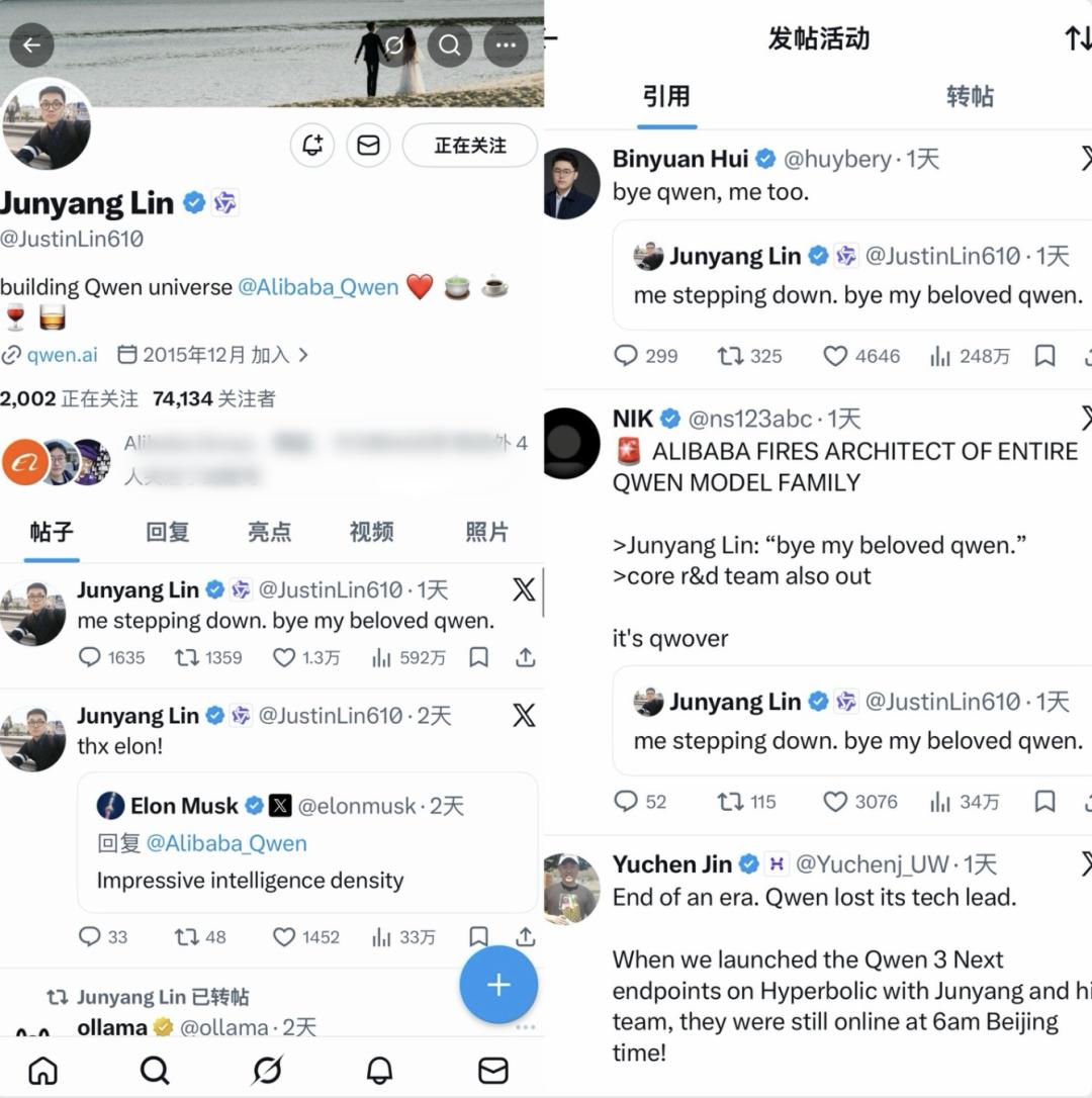 事发突然,就在Qwen3.5小模型0.8B/2B/4B/9B刚刚开源发布,并获Elon Musk点赞后不到48小时里,3月4日深夜,林俊旸在社交平台X(原Twitter)上“官宣”离职,“me stepping down. bye my beloved qwen.”,该帖迅速获得1.3万点赞、近600万浏览,引发全球AI社区关注和讨论。