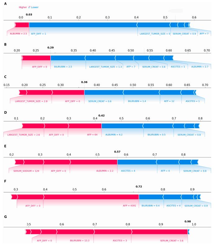 另外,亚组分析还清晰地揭示了导致高死亡率风险的两个主要原因,即严重的肝功能衰竭(以高胆红素、高肌酐和中度腹水为特征,三者均对应正向 SHAP 值,显著增加死亡风险)和活跃的肿瘤进展(以高 AFP 水平为特征)。