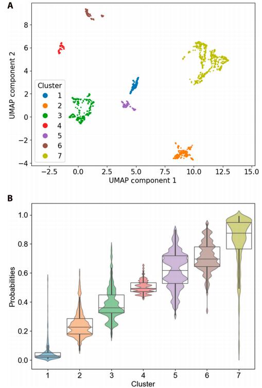 A 为基于 SHAP 嵌入值的 UMAP 2D 可视化聚类,B 为 7 个聚类观测值的死亡概率箱型图和群体图