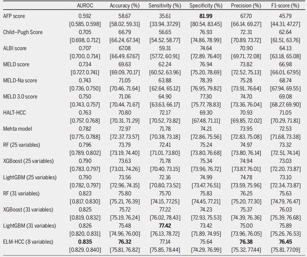 * 基于 SHAP 筛选 8 个关键变量构建的全新风险评分 ELM-HCC,预测精度显著优于传统评分